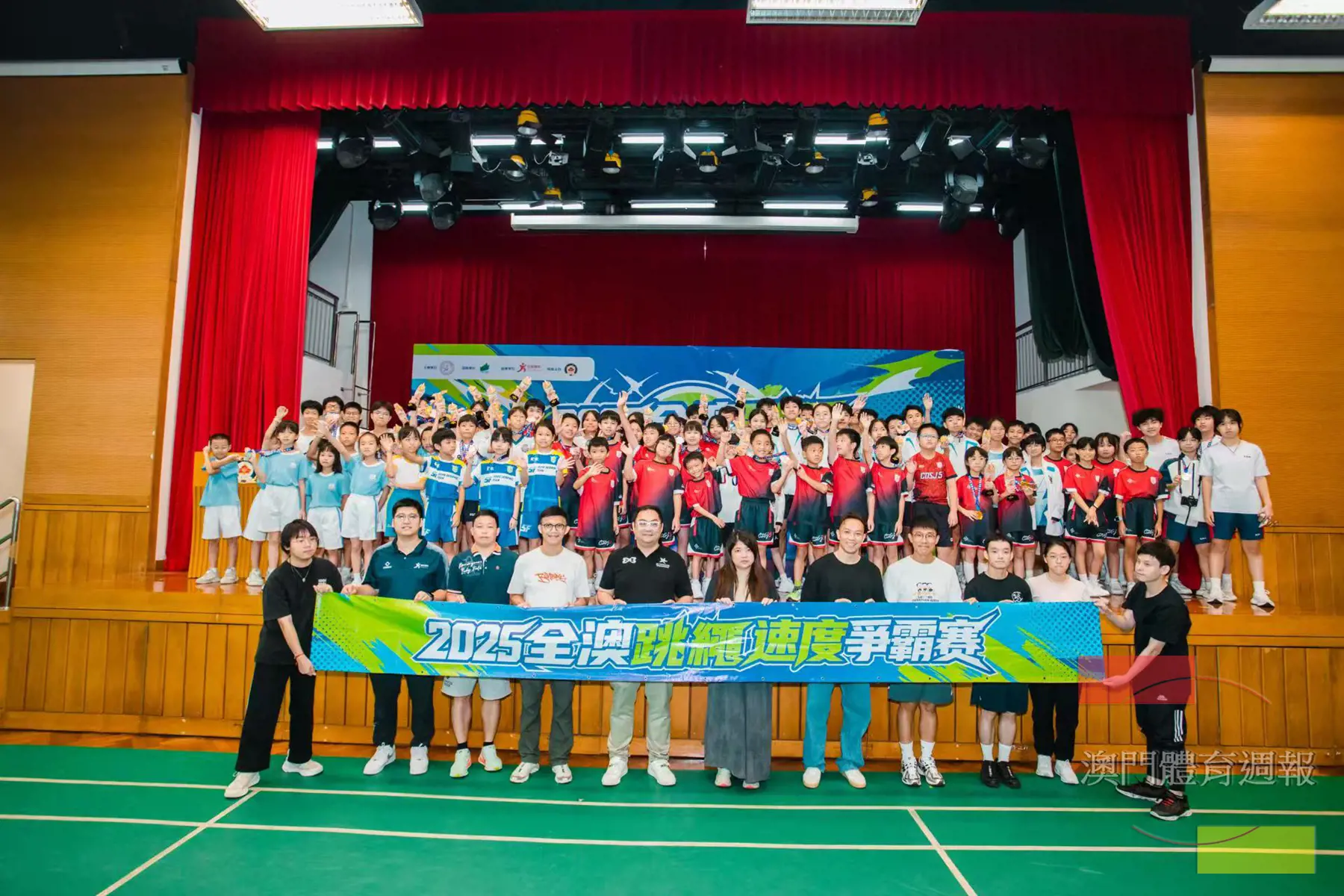 由中國澳門跳繩總會主辦,教育及青年發展局資助,澳門亞莘體育文化有限公司承辦及鏡平學校場地支持的“全澳跳繩速度爭霸賽”,於週六(18日)假鏡平學校順利舉行。賽事大合照 本屆賽事反應熱烈,共吸引來自全澳
