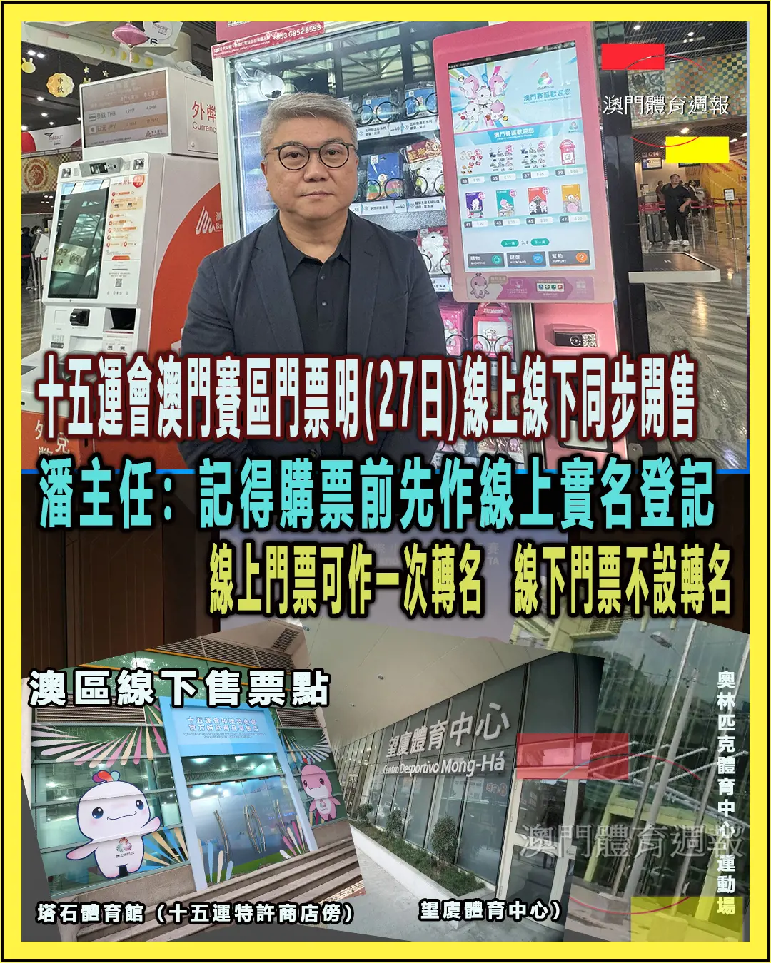 十五運會及殘特奧會澳門賽區門票將於明(27日)作線上及線下同步開售,十五運會及殘特奧會澳門賽區籌備辦公室主任潘永權呼籲有意購買門票的澳門市民儘早登記,同時提醒市民購票前必須透過官方線上票務平台進行