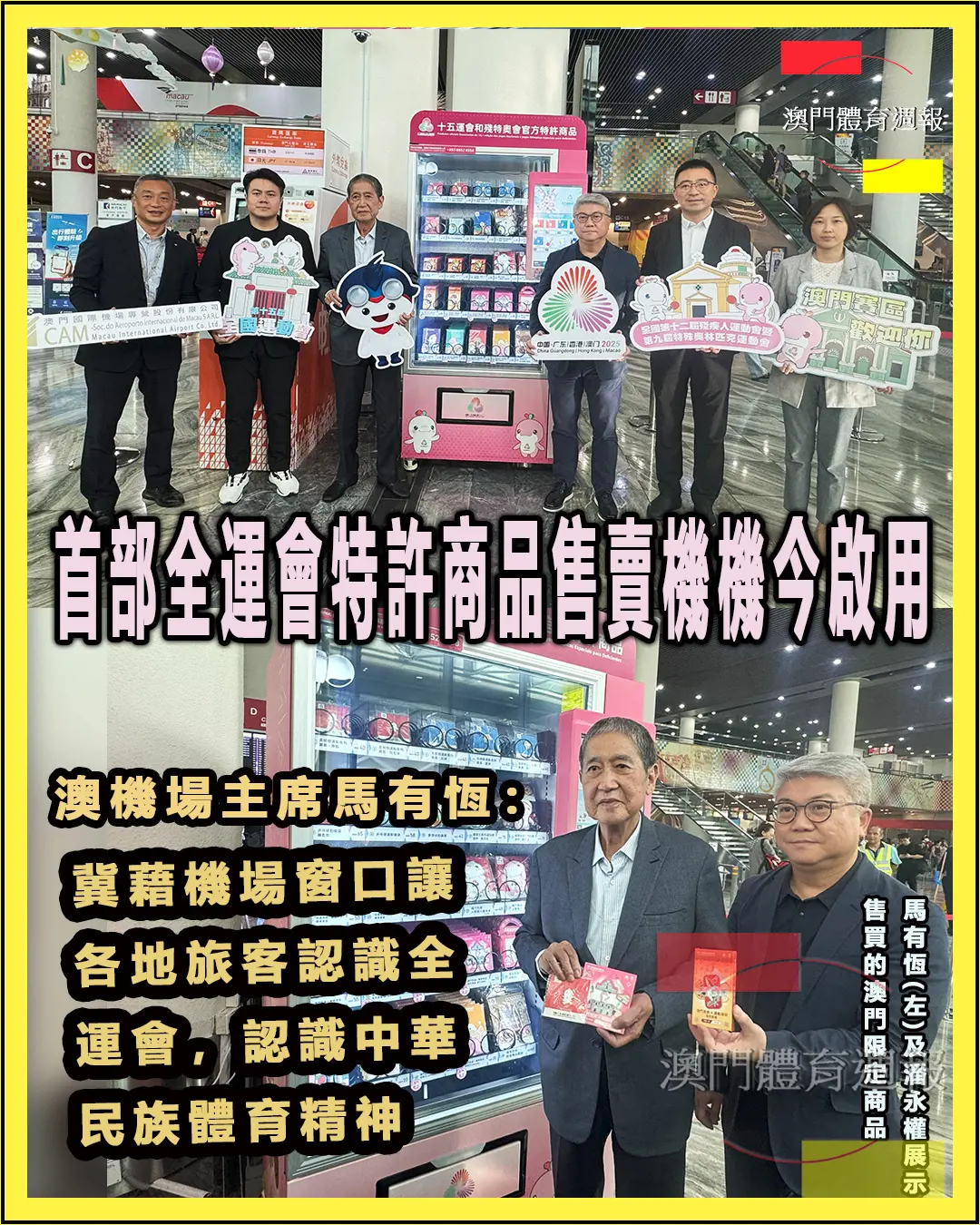 十五運會和殘特奧會首部官方特許商品售賣機今日(26日)起在澳門機場離境大堂投入運作,機場公司董事會主席馬有恆在啟用儀式時期望透過全運會盛事及藉澳門國際機場窗口讓旅客看到中華民族的體育精神,澳門賽區籌備