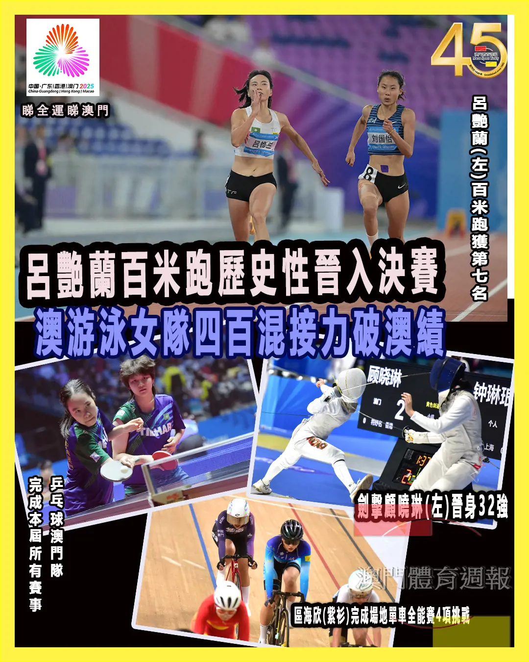距離全運會閉幕進入倒數階段,澳門體育代表團昨(17)日繼續出戰多個項目比賽,包括劍擊、單車(場地)、游泳、田徑、排球(女子成年組)及乒乓球等。 呂艷蘭歷史性闖全運100米決賽 田徑賽場的焦點落