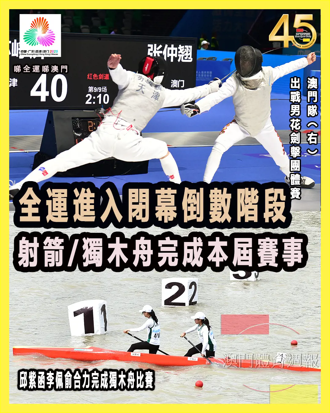 全運會進入閉幕倒數階段,澳門體育代表團昨(19)日分別進行了劍擊、獨木舟、射箭、排球(男子成年組及女子成年組)的項目比賽。 張仲翹(右)最後一場助隊伍搶回不少分數劍擊賽事方面,澳門隊先後派出張仲翹、