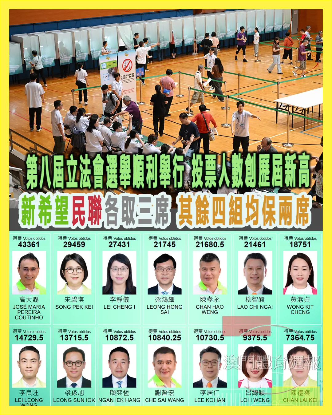 澳門特別行政區第八屆立法會選舉昨(14)日順利舉行,並完成初步點票工作,選管會公布初步點票結果,直接選舉共有175,272位選民投票,投票人數為歷屆最多,投票率53.35%,較上屆多近11個百分點