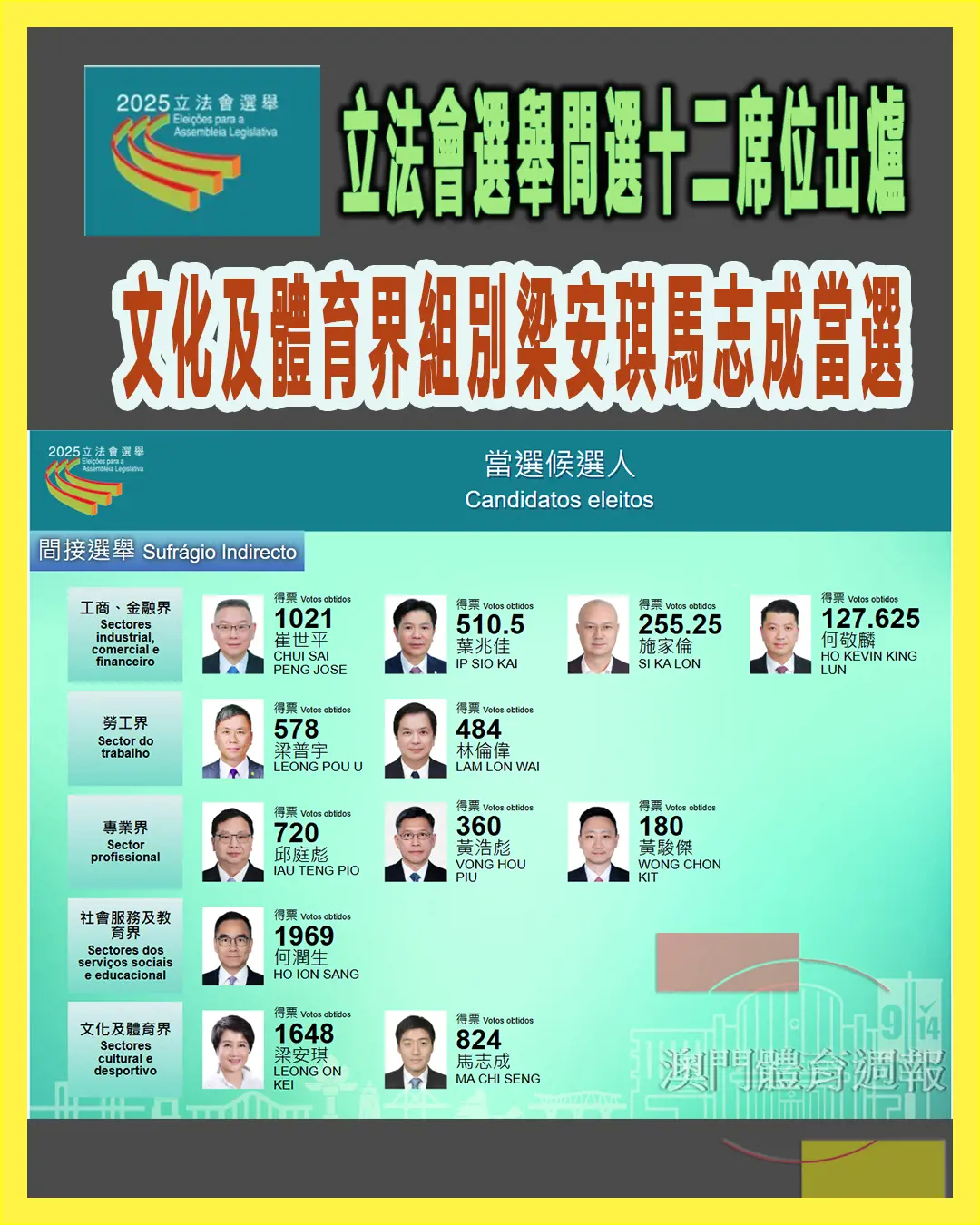 澳門特別行政區第八屆立法會選舉昨(14)日順利舉行,並完成初步點票工作,選管會公布初步點票結果,間接選舉共有6,645位選民投票,投票率88.12%。五個界別中,文化及體育界選舉組別兩個席位由旭昇文體