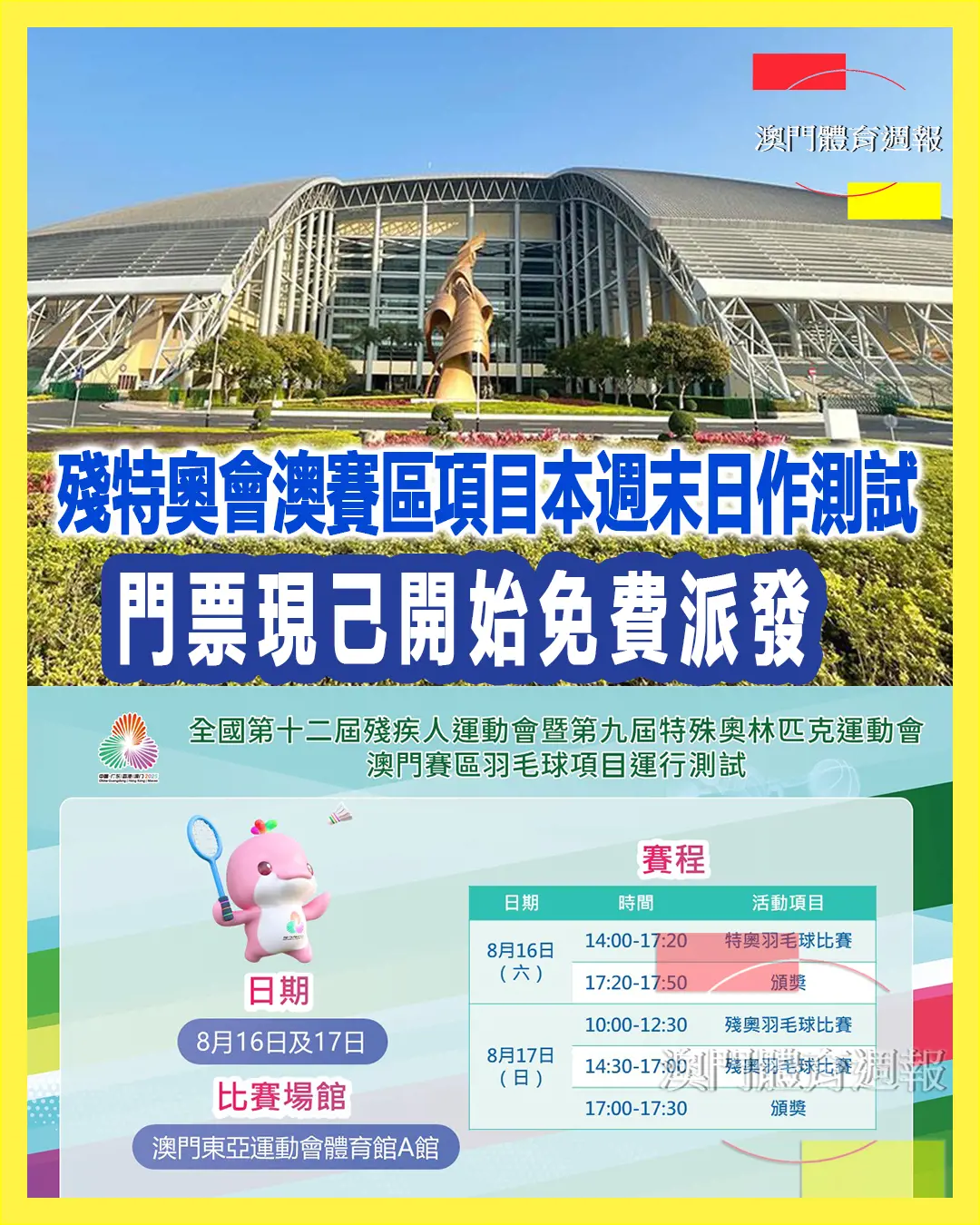 全國第十二屆殘疾人運動會暨第九屆特殊奧林匹克運動會將於本年12月8至15日由粵港澳三地聯合舉辦,澳門賽區將承辦殘奧和特奧兩個羽毛球比賽項目。為完善賽事籌備工作,十五運會及殘特奧會澳門賽區籌備辦公室將於