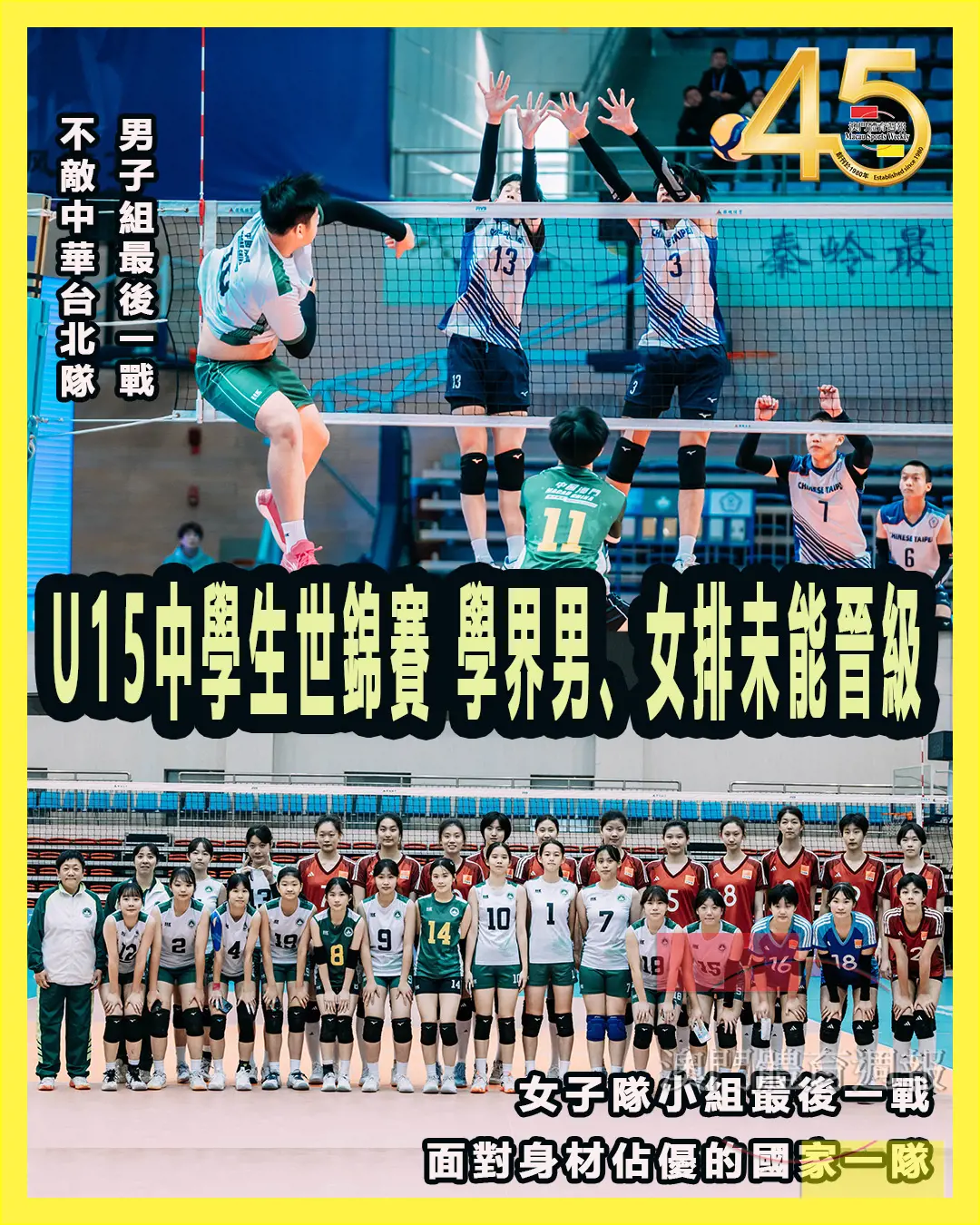 2025年U15世界中學生排球錦標賽,澳門學界U15男、女子排球代表隊周一(8日)在小組賽最後一戰分別不敵中華台北和國家一隊,下階段將進入名次賽。主攻張藝翹網前開火接應黎卓賢挑戰對手攔網學界U