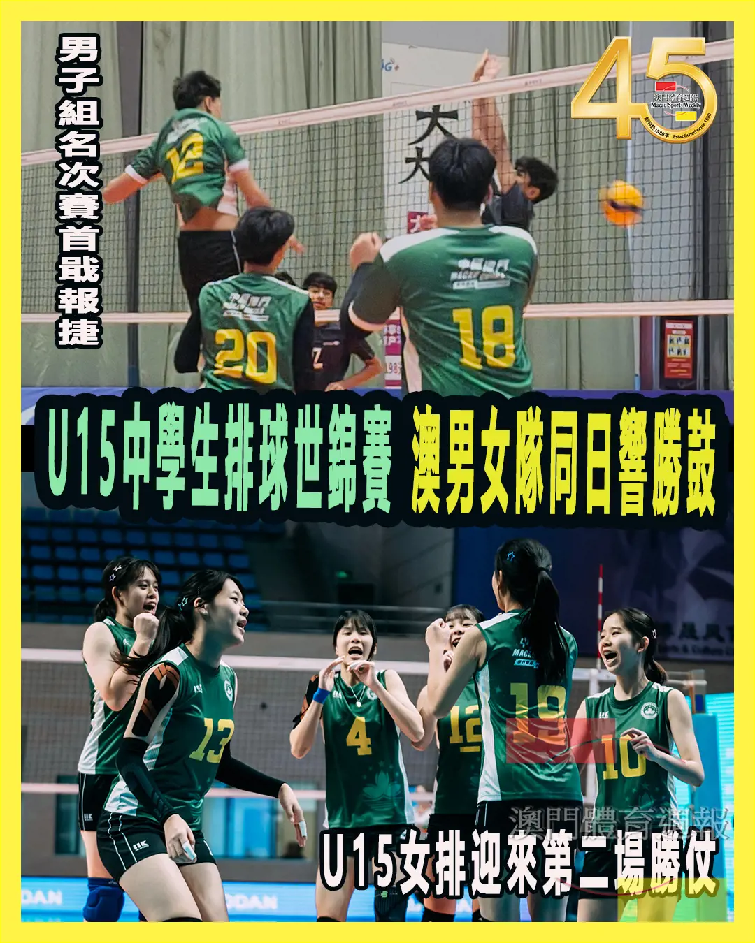 2025年U15世界中學生排球錦標賽,澳門學界U15男、女子排球代表隊周三(10日)齊響勝鼓,在名次賽首戰皆以直落兩局擊敗卡塔爾和保加利亞。U15男排名次賽首仗報捷學界U15男排開局入局較慢,初段戰況