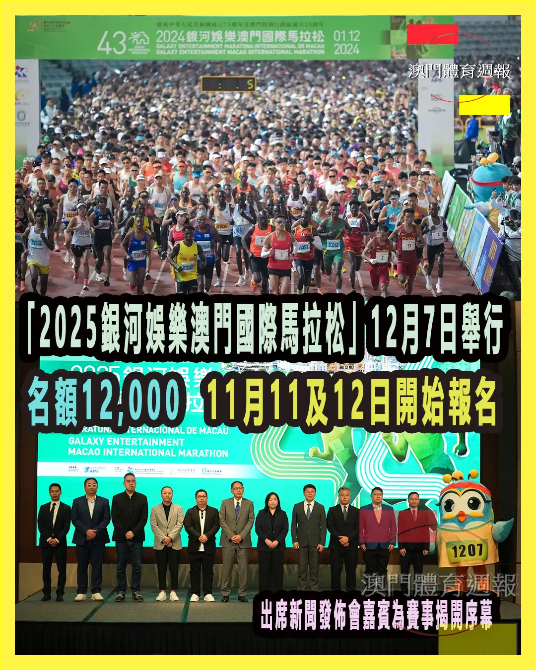 由體育局、銀河娛樂集團及澳門田徑總會主辦的「2025銀河娛樂澳門國際馬拉松」 將於本年12月7日(周日)舉行,各項目報名名額為:馬拉松1,800名,半程馬拉松4,800名,迷你馬拉松5,400名,今年