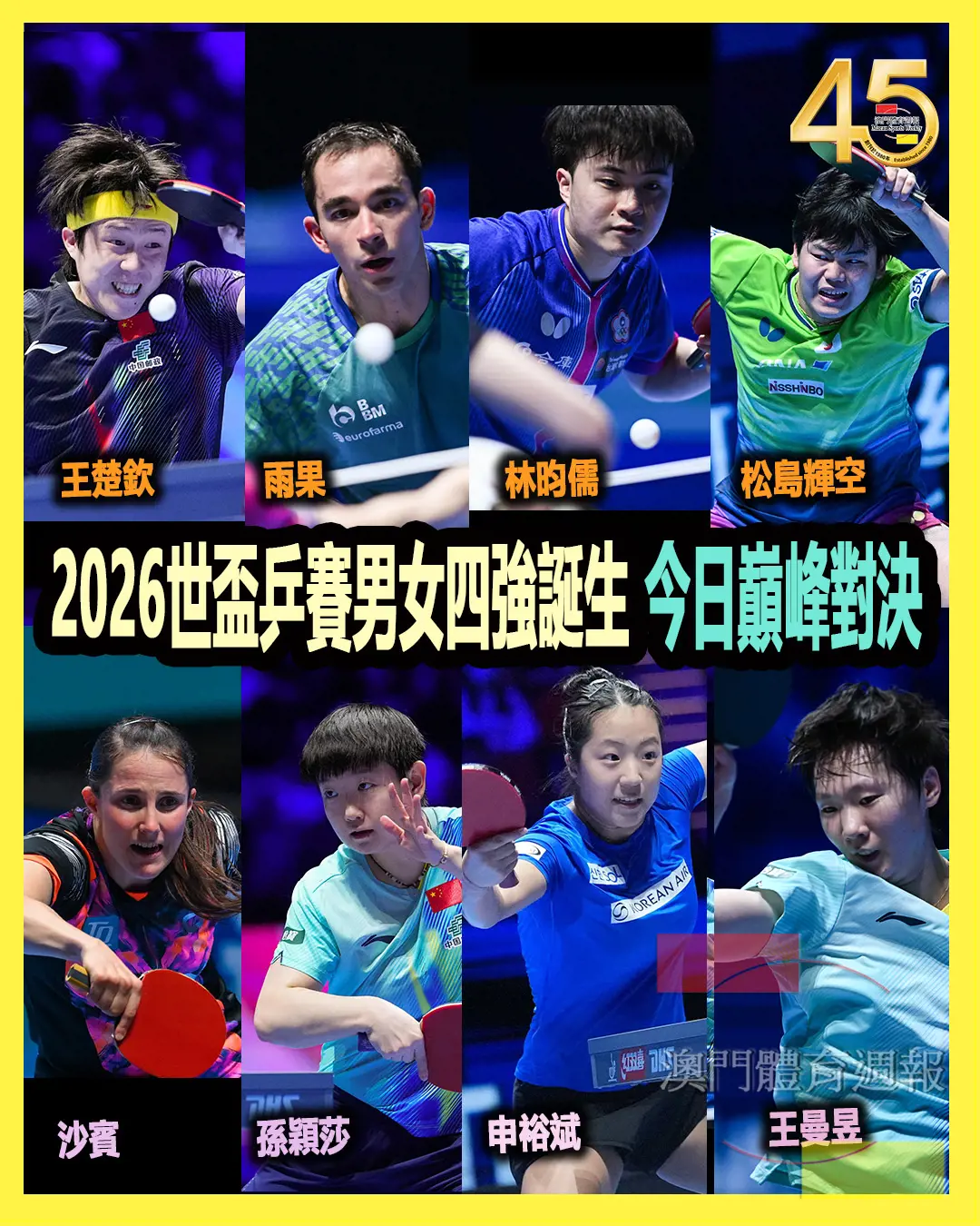 2026世盃乒賽男女四強誕生 今日巔峰對決由國際乒乓球聯合會(ITTF)授權,體育局、銀河娛樂集團及世界乒乓球管理集團有限公司主辦、澳門乒乓總會協辦的「2026年澳門國際乒聯男子及女子世界盃 ─ 由銀