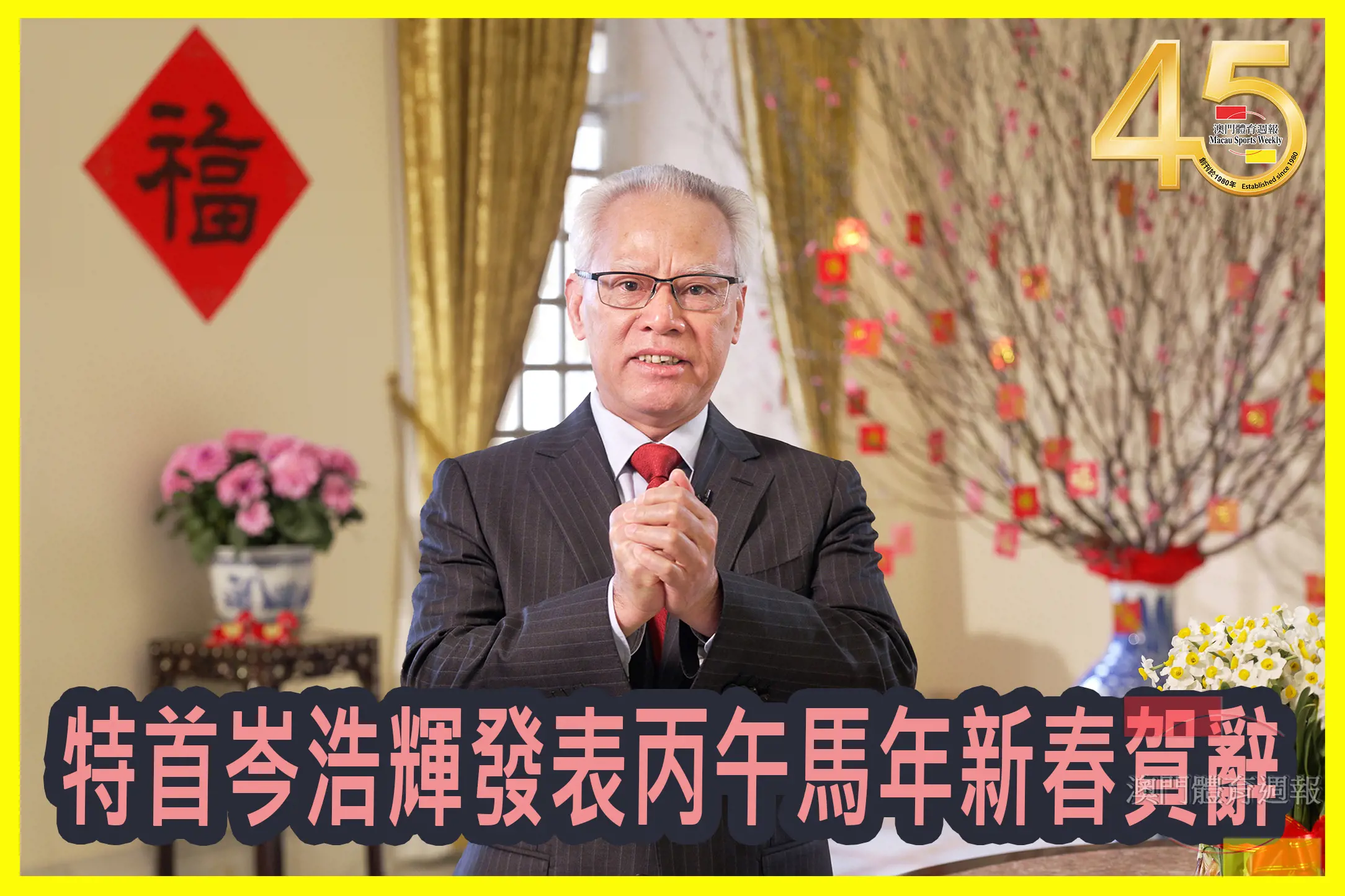 行政長官岑浩輝16日發表丙午馬年新春賀辭.全文如下: 各位澳門市民、各位朋友:金蛇辭舊歲,駿馬開新元。在萬家團圓、辭舊迎新之際,我謹代表澳門特別行政區政府,向全澳市民和所有關心支持澳門發展的海內外朋友